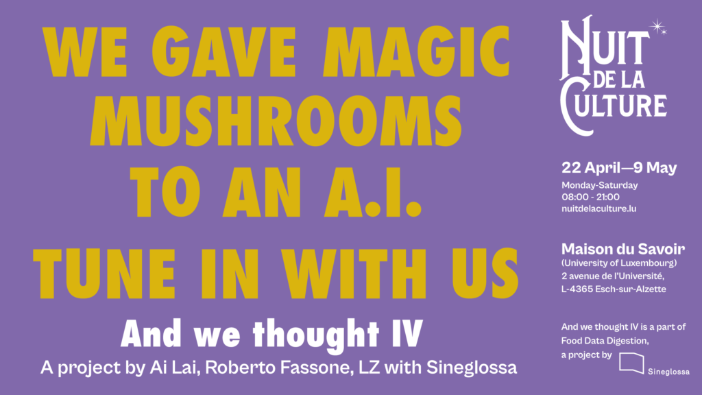 Cosa trovi in questa news And we thought IV, una nuova mostra a Lussemburgo And we thought è il progetto nato nel 2022 attraverso una collaborazione tra Sineglossa e l’artista visivo Roberto Fassone. L’idea era quella di creare un’entità artificiale che potesse sperimentare e narrare viaggi psichedelici. Per fare ciò, sono stati dati a un’intelligenza […]