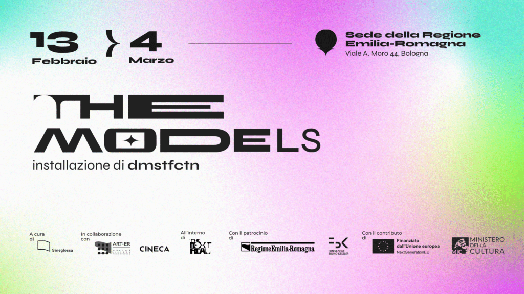 Dopo la prima assoluta al Tecnopolo di Bologna in occasione di ART CITY Bologna 2025, The Models, l’installazione audiovisiva interattiva sviluppata dal duo londinese dmstfctn, a cura di Sineglossa, verrà esposta presso la sede della Regione Emilia-Romagna (viale A. Moro 44, mezzanino del primo piano, Bologna), promossa dalla Direzione Generale Conoscenza Lavoro Imprese e il Settore […]