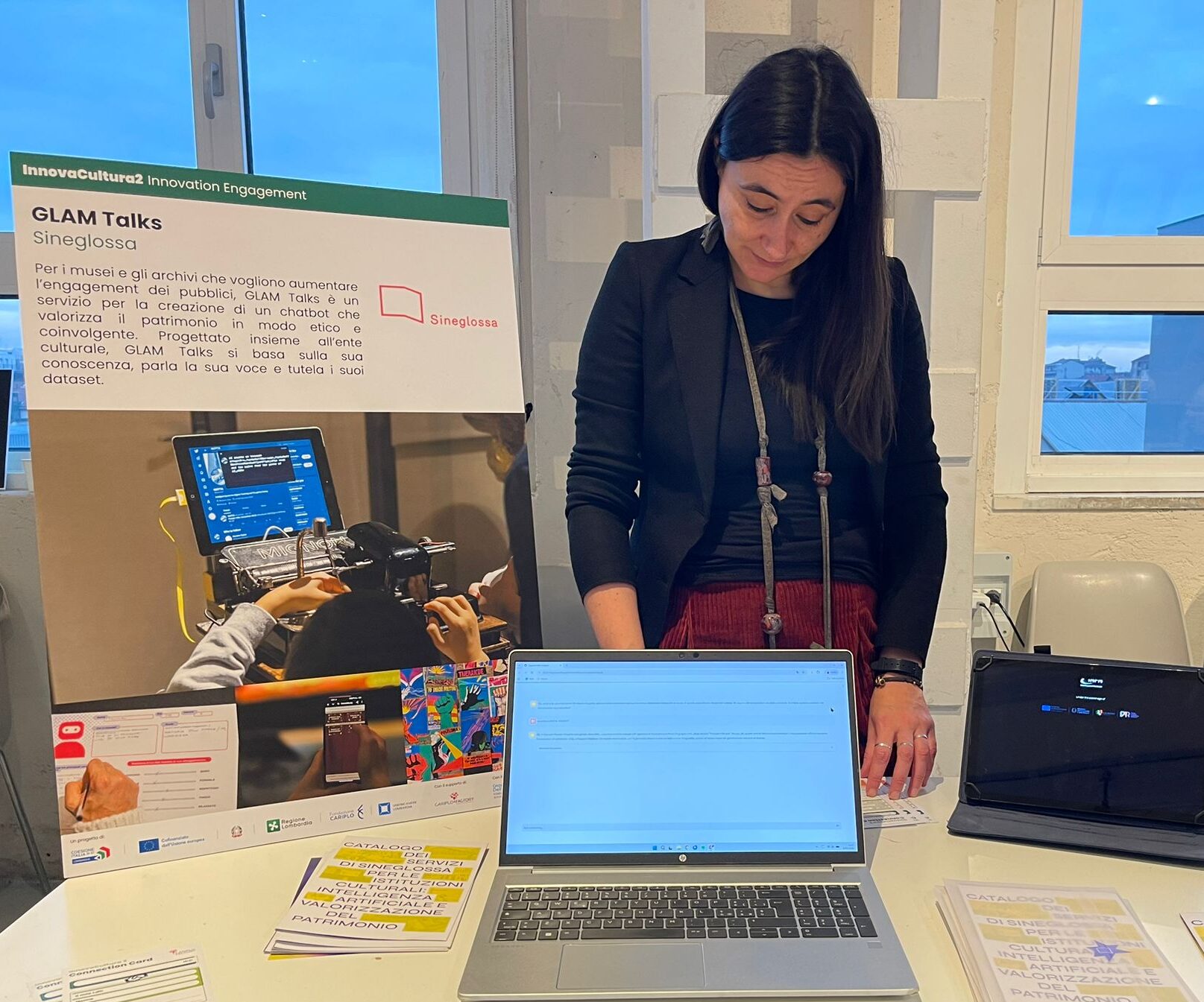Come raccontato nella scorsa newsletter, anche Sineglossa partecipa quest'anno al programma di empowerment di InnovaCultura, il progetto volto alla ricerca delle migliori realtà culturali e creative (ICC) interessate a sviluppare progetti innovativi in partenariato con istituti e luoghi della cultura (LdC) lombardi, per la creazione di nuovi paradigmi di produzione, distribuzione e promozione della cultura. Nell'ambito di questa iniziativa, abbiamo partecipato all'evento organizzato da Cariplo Factory per presentare ai luoghi della cultura lombardi la nostra soluzione digitale per musei e archivi: GLAM Talks, un servizio per la creazione di un chatbot che valorizza il patrimonio culturale dell'ente in modo etico e coinvolgente, perché sviluppato attraverso un percorso di co-design in cui vengono scelte insieme le informazioni con cui allenare l'IA e il tono di voce con cui caratterizzare il chatbot, così che sia su misura degli obiettivi e dell'identità del luogo della cultura. |