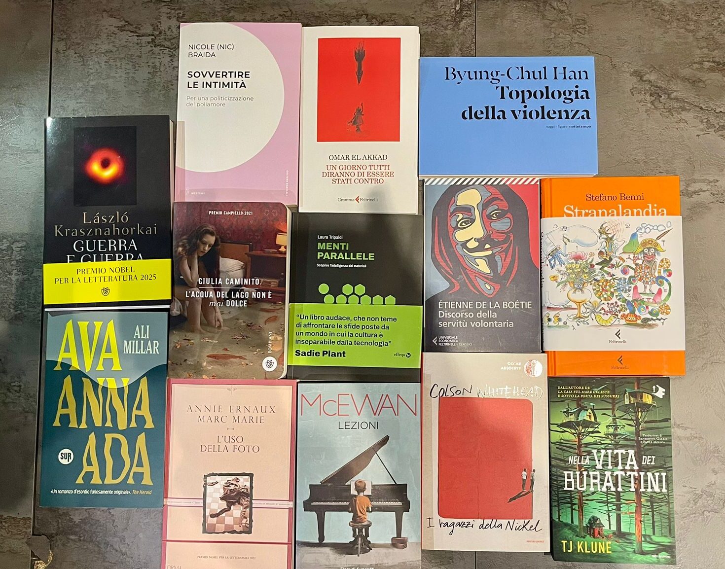 Anche quest'anno abbiamo approfittato dello scambio dei regali di Natale per sostenere la lettura. Come? Con un Secret Santa letterario. Ognunǝ ha scelto un libro da regalare e ha sorteggiato chi lo avrebbe ricevuto. Ed ecco qui la lista dei titoli che abbiamo scelto: Guerra e guerra (László Krasznahorkai, trad. it. Matteo Colombo, 2025, Einaudi) Sovvertire le intimità. Per una politicizzazione del poliamore (Nicole (Nic) Braida, 2025, Meltemi) Un giorno tutti diranno di essere stati contro (Omar El Akkad, 2025, Gramma Feltrinelli) Topologia della violenza (Byung-Chul Han, 2011, Nottetempo) L’acqua del lago non è mai dolce (Giulia Caminito, 2021, Bompiani) Menti parallele. Scoprire l’intelligenza dei materiali (Laura Tripaldi, 2020, Effequ) Discorso della servitù volontaria (Étienne de La Boétie, 2014, Feltrinelli) Stranalandia (Stefano Benni, 2025, Feltrinelli) Ava Anna Ada (Ali Millar, 2025, SUR) L’uso della foto (Annie Ernaux & Marc Marie, 2025, L’Orma) Lezioni (Ian McEwan, 2023, Einaudi) I ragazzi della Nickel (Colson Whitehead, 2021, Mondadori) Nella vita dei burattini (T.J. Klune, 2025, Mondadori)
